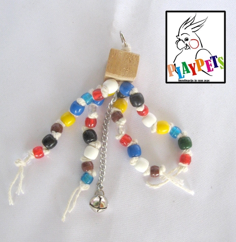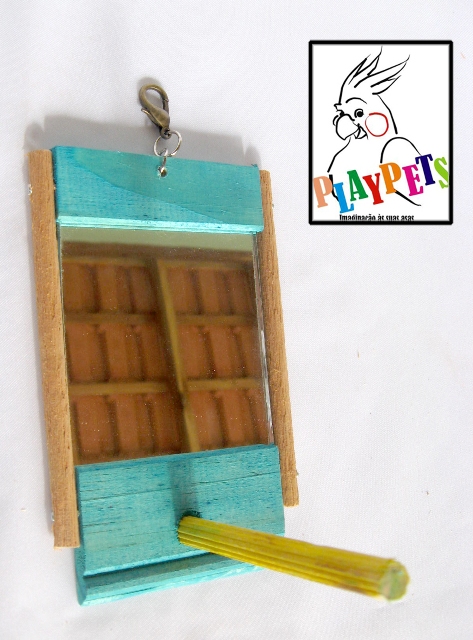 Espelho pequeno com madeiras e miçangas nas laterais.